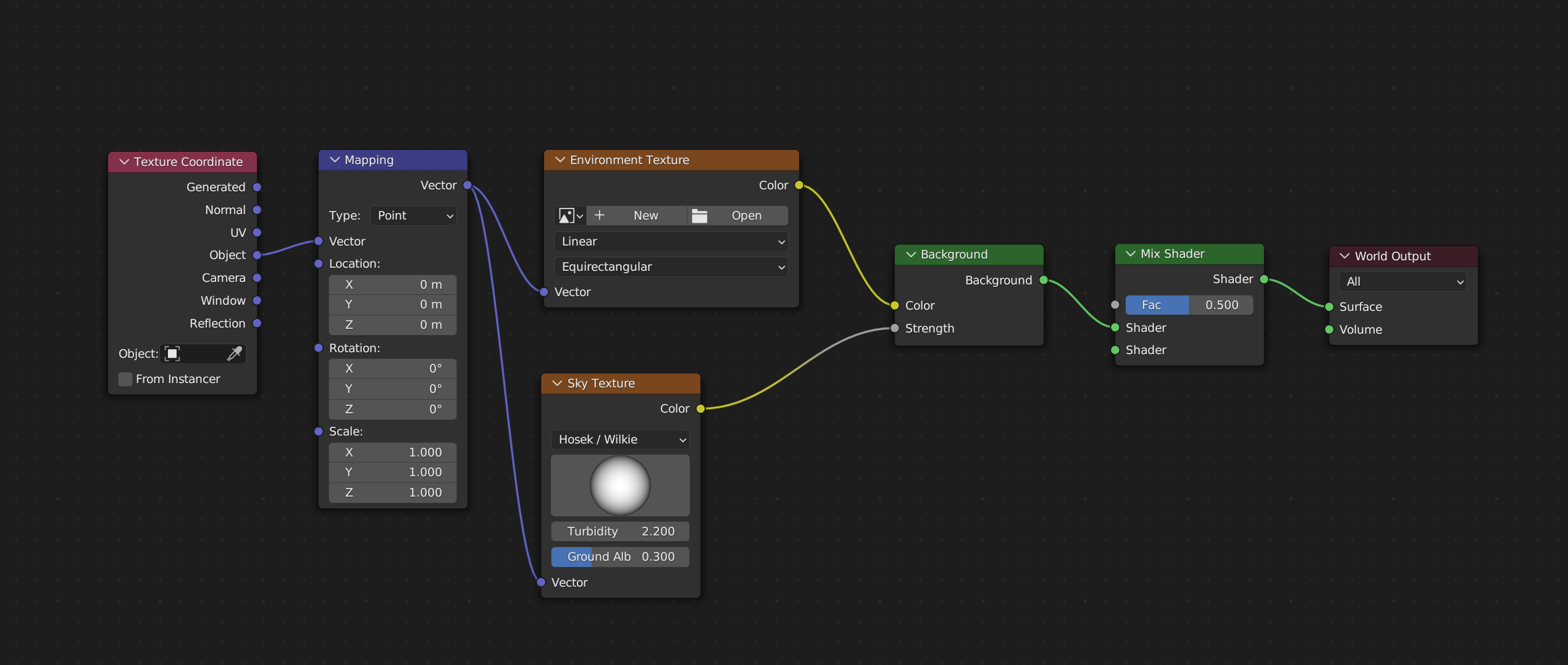 2. 다운받은 HDRI파일을 Environment Texture에 넣고 Mapping으로 빛의 방향을 조정한다.