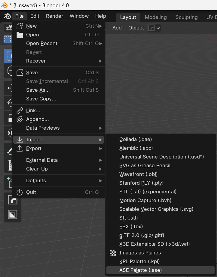 ASE Palette를 클릭해서 다운로드 받은 팔레트를 임포트 합니다.