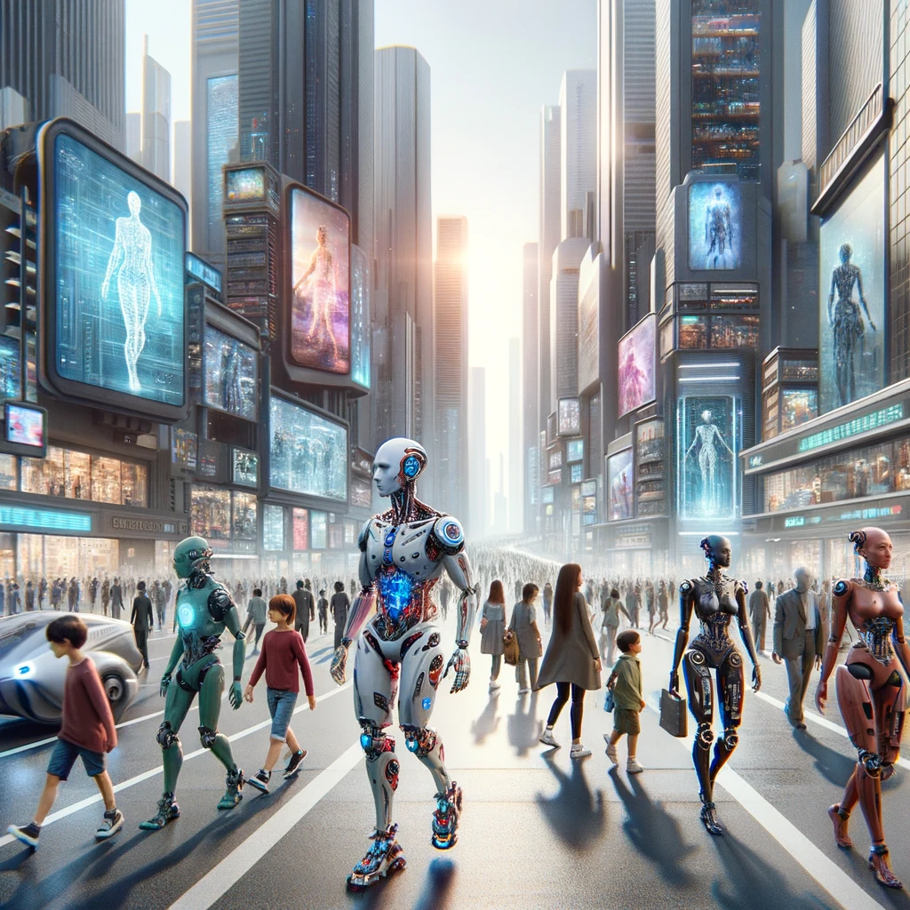 [ 모든 직업을 로봇이 대체한 사회를 그려줘 ]