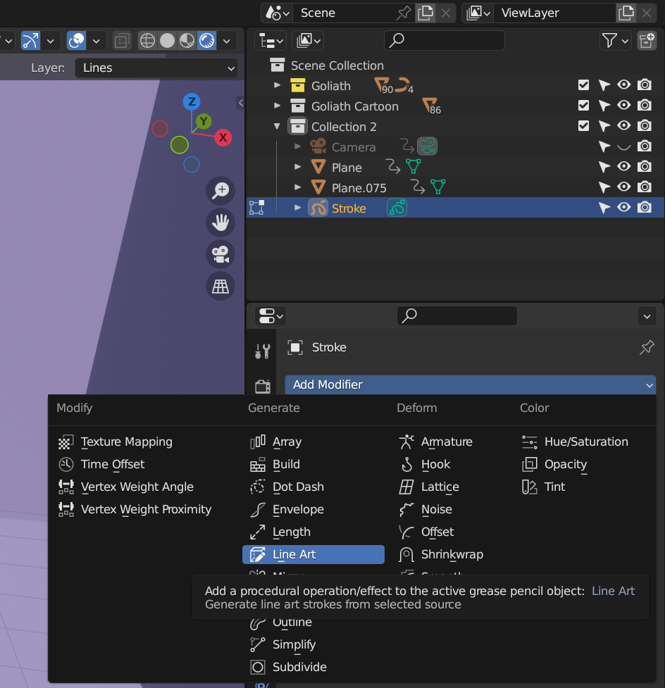 2. Stroke를 선택하고 Modifier에서 Line Art를 추가한다.