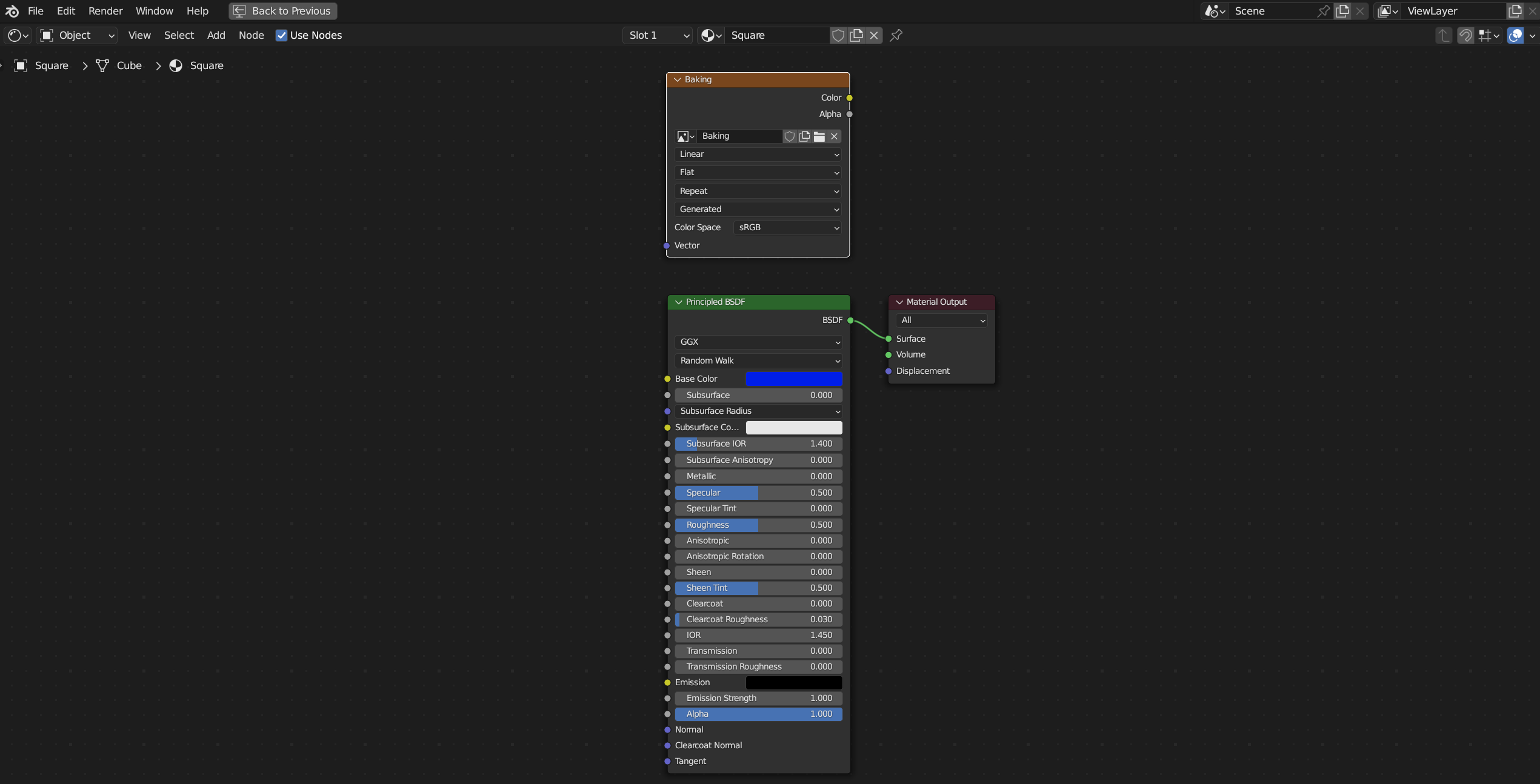 8. 주의할점! 베이크 버튼을 누르기전에 Shading 워크스페이스에 UV맵으로 만든 Baking이 들어간 Image Texture 노드가 전부 선택이 되고, 오브젝트모드에서 베이킹을 할 모든 오브젝트가 선택된 상태인지 확인해야합니다.