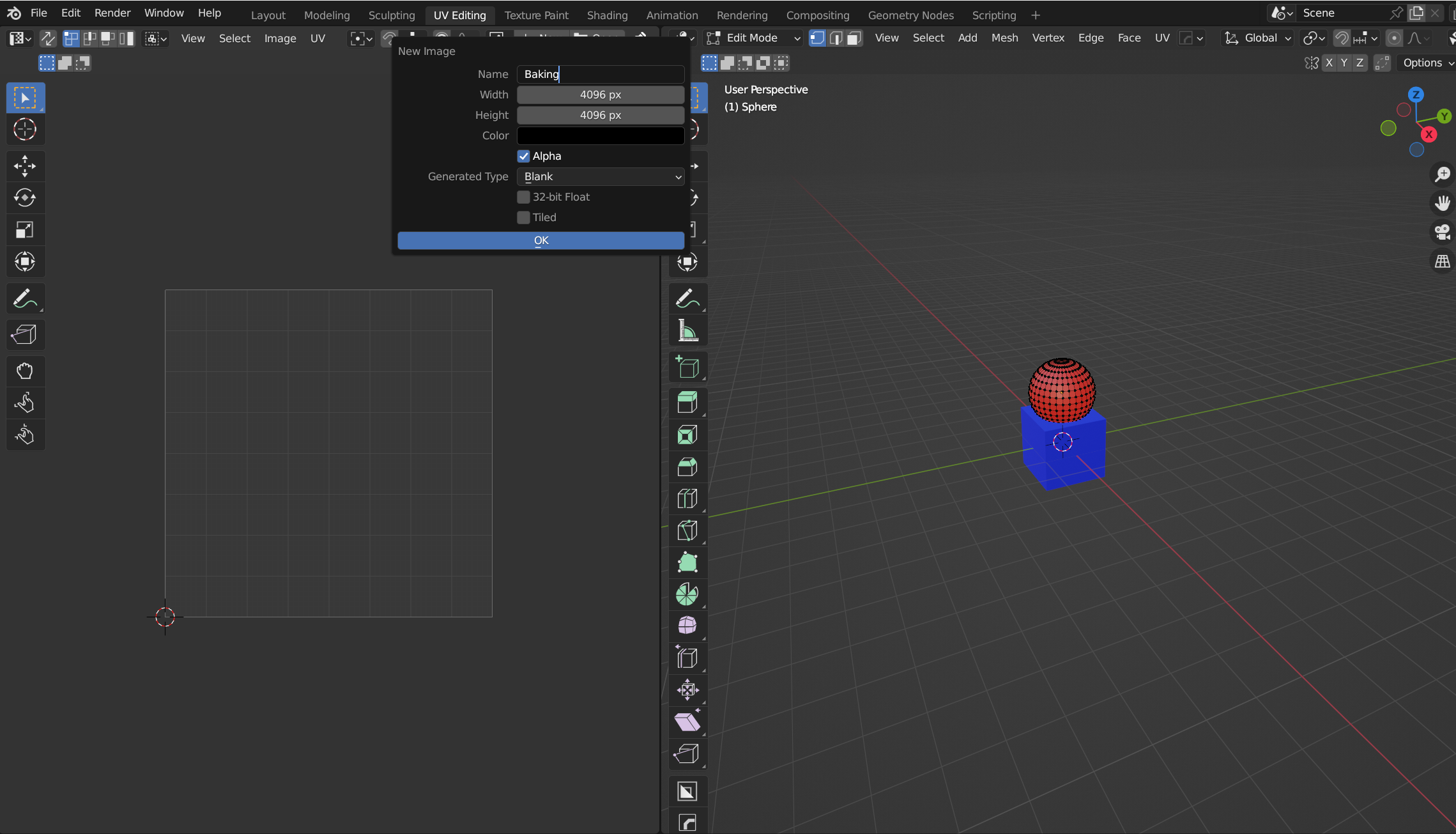 9. 아래와 같이 Sphere과 Square의 텍스쳐가 하나의 UV맵으로 베이킹되었습니다.