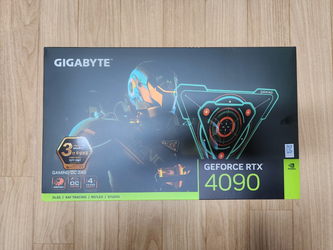 컴퓨존에서 2023년 5월 말에 구매한 기가바이트 Gaming OC RTX4090 24GB 제이씨현 이며, 보시다시피 박스자체에는 투명비닐 씰링이 안되어있습니다. 듣기로는 이엠텍은 박스자체가 투명비닐로 씰링 되어있다는 것 같은데 기가바이트는 아닌가 봅니다.