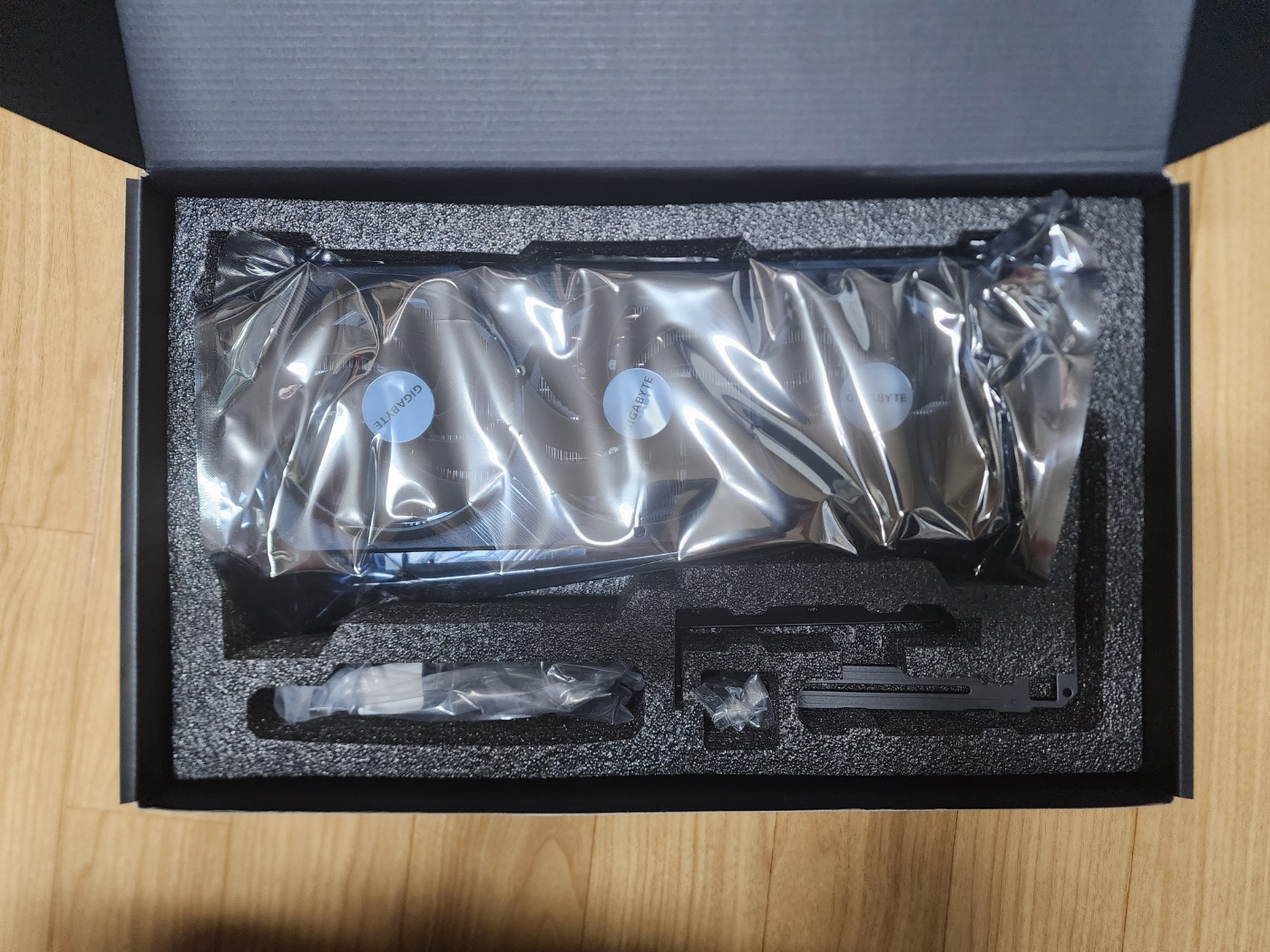 검은 박스를 오픈하면 기다리고 고대하던 영롱한 그래픽카드가 충격방지용 쿠션?에 쏙 들어가 있는 모습을 볼 수 있습니다. 그래픽카드는 정전기 방지 비닐에 잘 싸여 있군요!