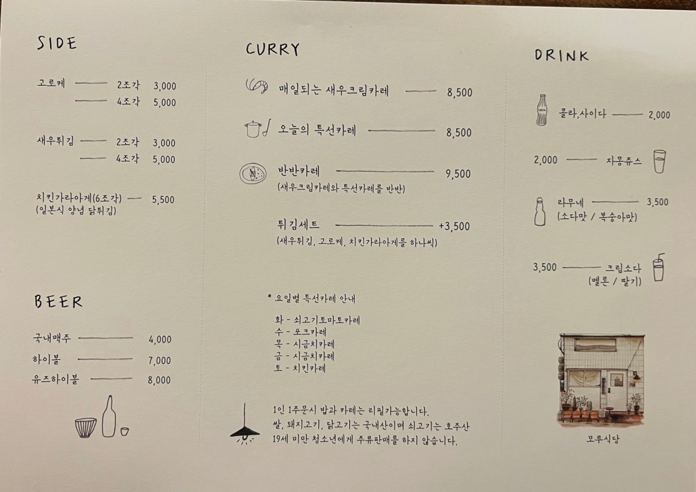 새우크림카레가 선호도가 높으니까 꼭 먹어보도록하고 다른 맛도 먹고 싶으면 주문할때 반반으로 주문해서, 특선카레 반을 선택하면된다. 특선카레는 요일별로 다르니까 원하는 카레가 나올때 방문하면된다.