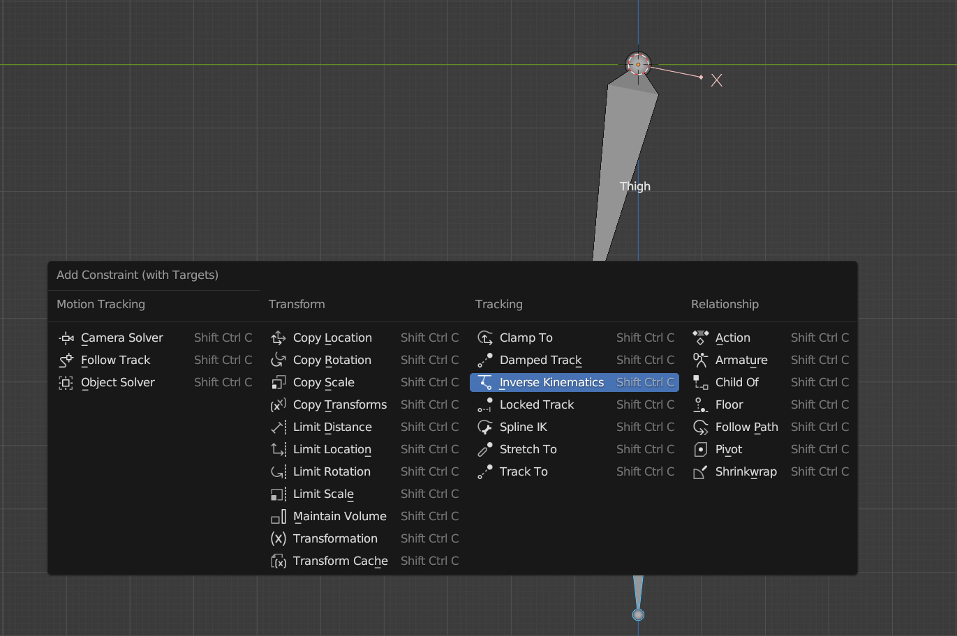 7. Ctrl+Shift+C를 누르면 Constraint를 설정하는 창이 뜬다. IK를 선택한다.