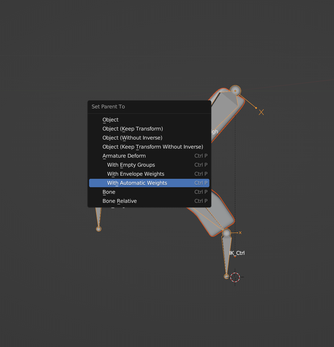 14. Object Mode에서 Shift를 누른상태에서 만들어둔 다리를 선택, 그리고 만들어둔 Armature를 선택한 후 Ctrl+p클릭하여 with Automatic Weights를 클릭하면 리깅이 완성 됩니다.