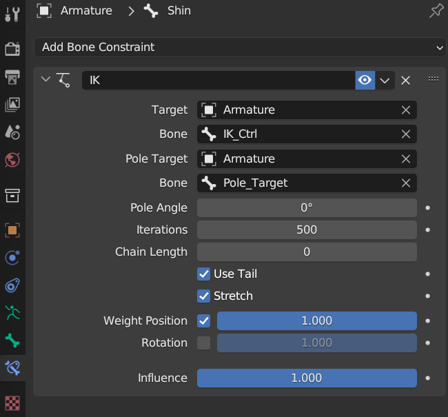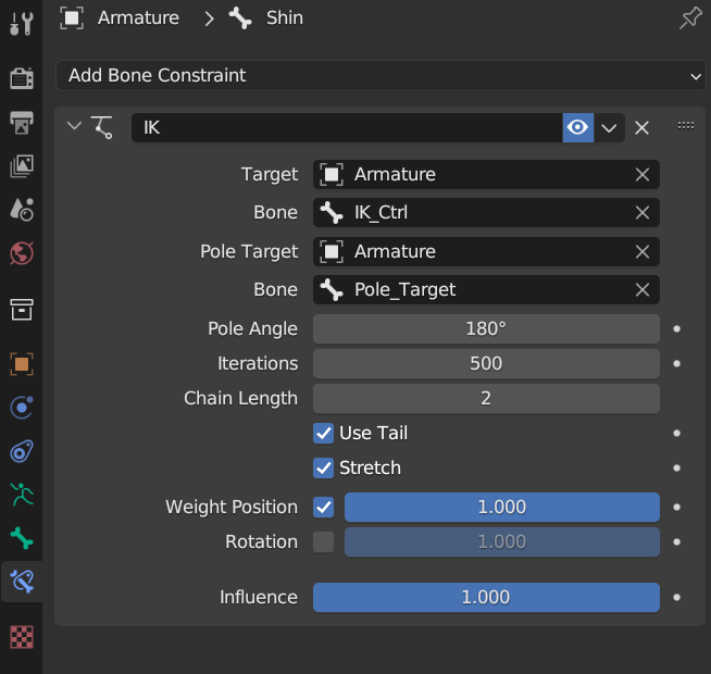 11. Pole Target은 Armature, Bone은 Pole_Target을 넣어줍니다.