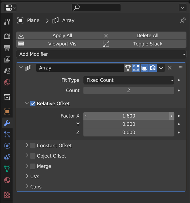 4. Plane에 Array를 적용. Factor X를 조정하여 스티치의 간격을 조정하고, Count로 필요한 스티치 갯수만큼 추가합니다.