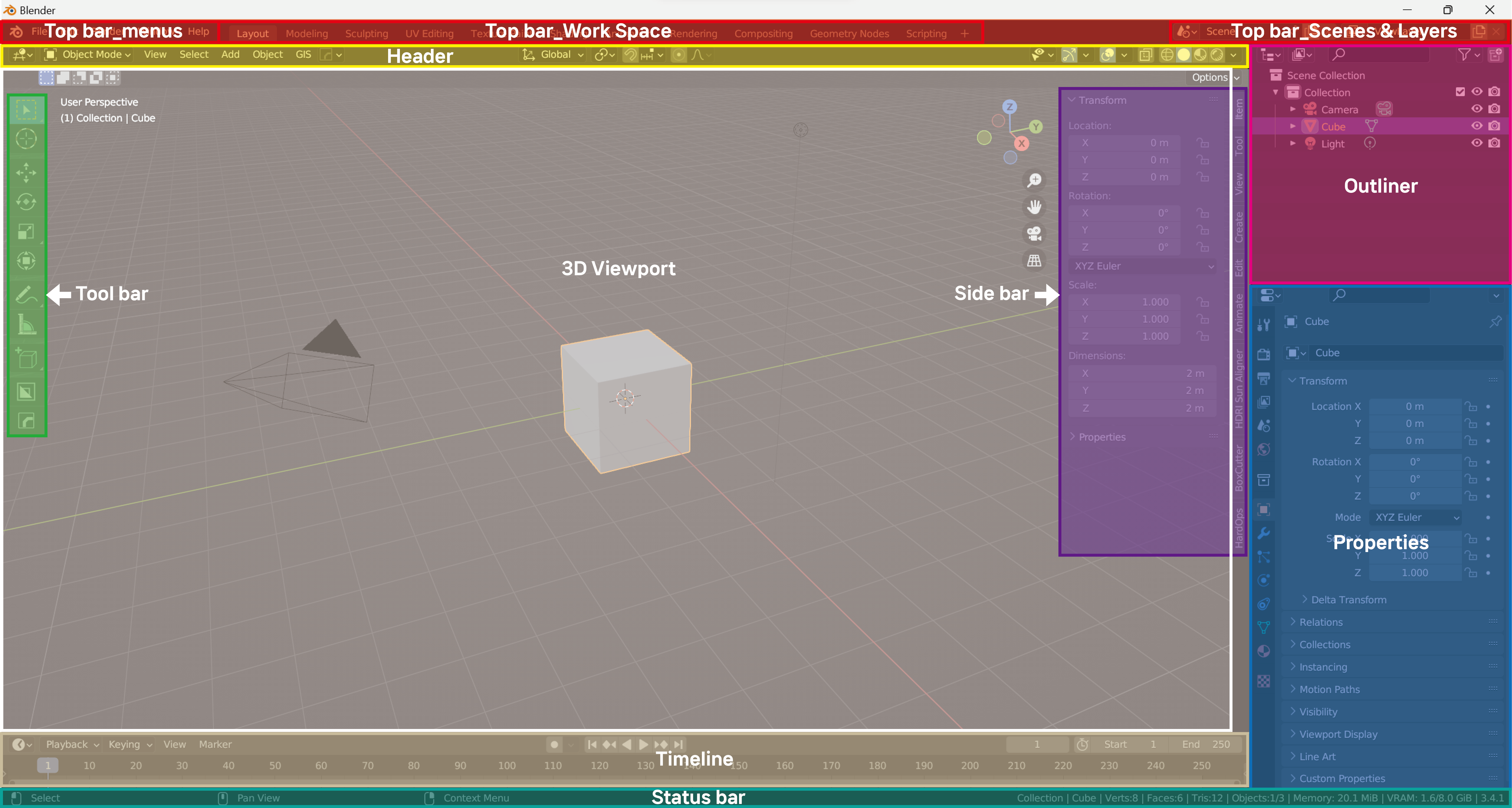 그래서 오늘을 블렌더 인터페이스를 알아보기 쉽도록 그림 하나로 편집하여 보여드리려고 합니다.