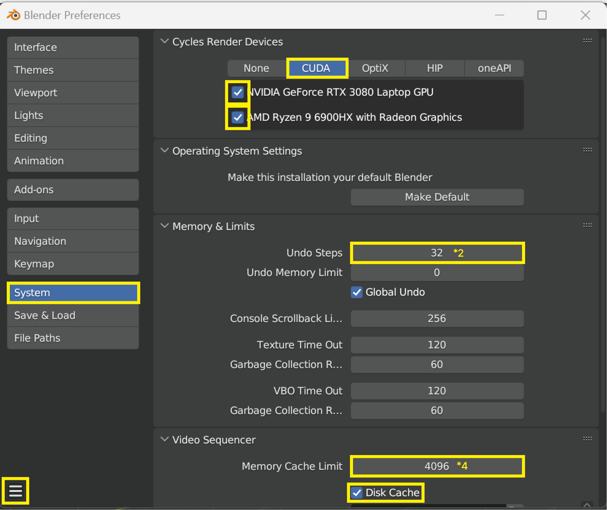 3. 탑바에 Edit>Preferences>System>CUDA>그래픽카드를 체크해주고 Memory&Limits>Undo Steps을 더 늘리면 뒤로 돌아가는 횟수가 많아져서 복구하는데 도움이 되기때문에 원하시는 만큼 적절히 늘려줍니다. Video Squencer>Memory Cache Limit 4096 * 4 = 16G정도로 수정>Use Disk Cache 체크해줍니다. Disk Cache를 체크해주면 메모리가 부족해서 블렌더가 셧다운 되는 것을 방지해주기 때문에 소중한 작업물이 날아가는 것을 방지 할 수 있습니다. 모든 설정이 끝나면 왼쪽 하단 줄3개를 클릭하여 Save Preferences를 꼭 해주시길 바랍니다.